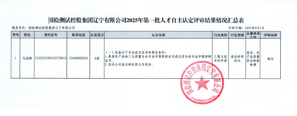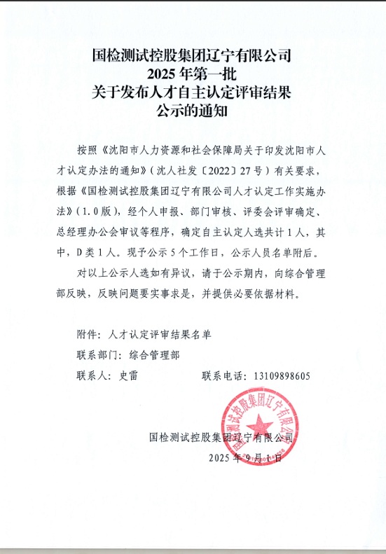 國檢測試控股集團(tuán)遼寧有限公司 ⒛犭年第一批 關(guān)于發(fā)布人才自主認(rèn)定評審結(jié)果 公示的通知 |